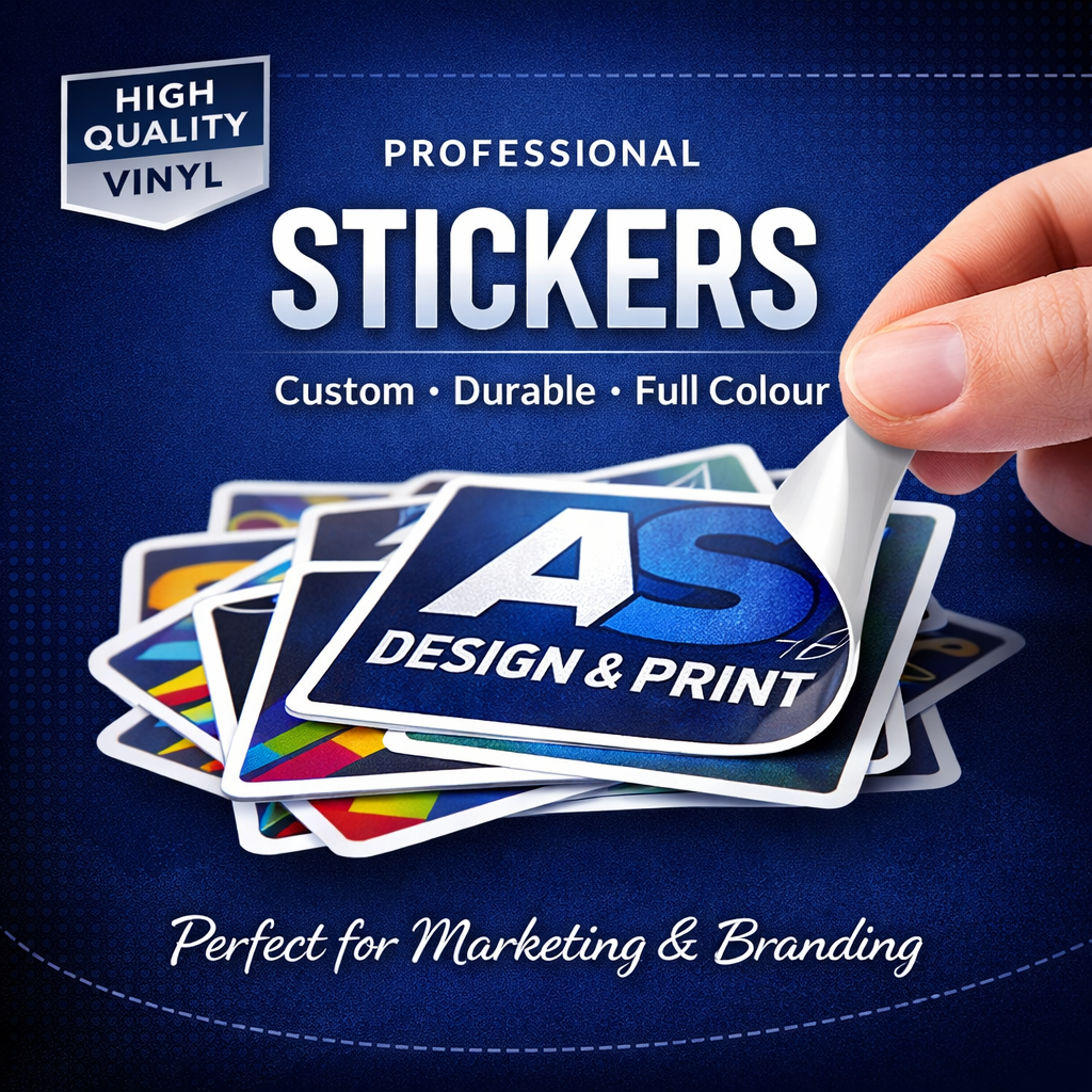 Custom stickers are the fastest and easiest way to promote your business, product, or event – and AS Design & Print is the easiest way to buy custom stickers. We'll make beautiful vinyl custom stickers from any artwork, logo, or photo. All stickers are laminated making them perfect for outdoor use.