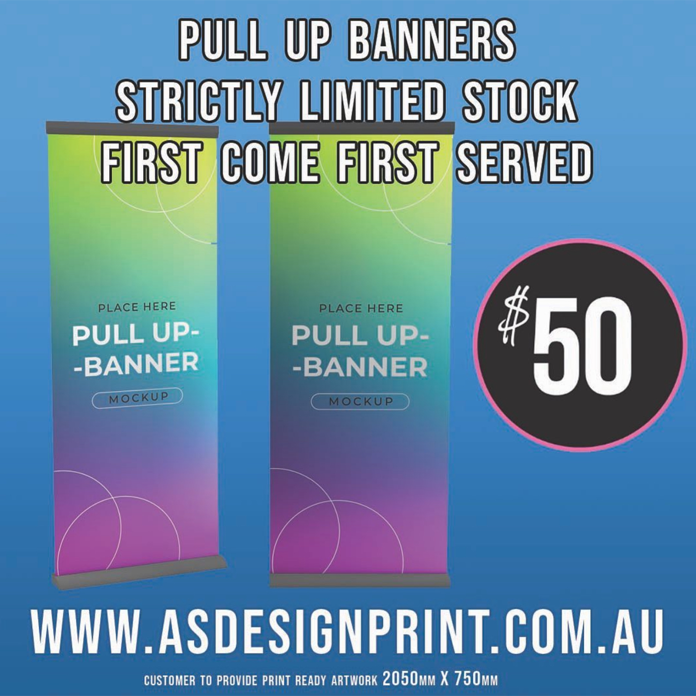 Special Offer whilst stocks last , Pull Up banners now only $50 just upload your completed artwork 2050mm X 750mm we will take care of the rest. (Artwork charges apply if artwork not print ready)